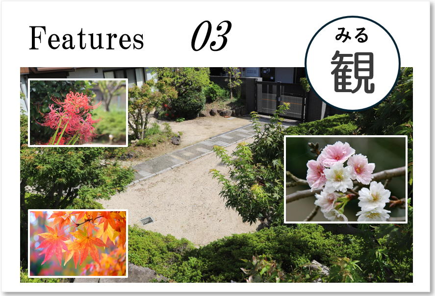 春は桜、秋は紅葉。プライベート感の強い広々としたお庭で贅沢に楽しめます。天気の良い日はお庭でぽかぽか「日向ぼっこ」や元気にラジオ体操も。